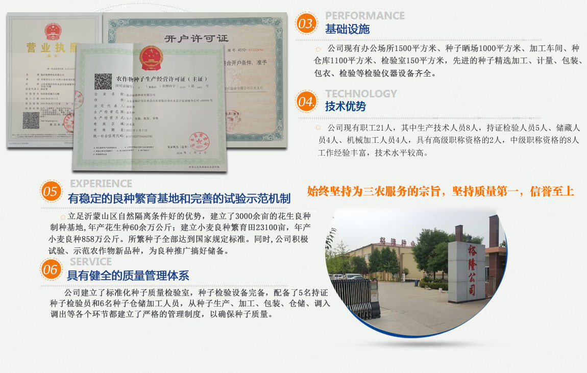 臨沂裕隆種業(yè)有限公司成立于2005年,是一家集主要農(nóng)作物種子生產(chǎn)、經(jīng)營于一體的民營企業(yè)。公司成立以來,立足當(dāng)?shù)貎?yōu)越的土地、氣候、自然隔離等優(yōu)勢條件,以發(fā)展小麥、花生、蔬菜良種繁育為主,同時(shí)代理經(jīng)營玉米、化肥等農(nóng)作物良種及肥料。目前主要經(jīng)營各類花生種子,小麥種子,玉米種子,蔬菜種子及專用復(fù)合肥料。